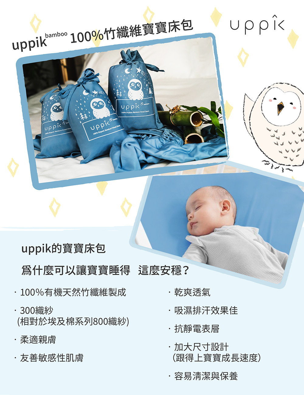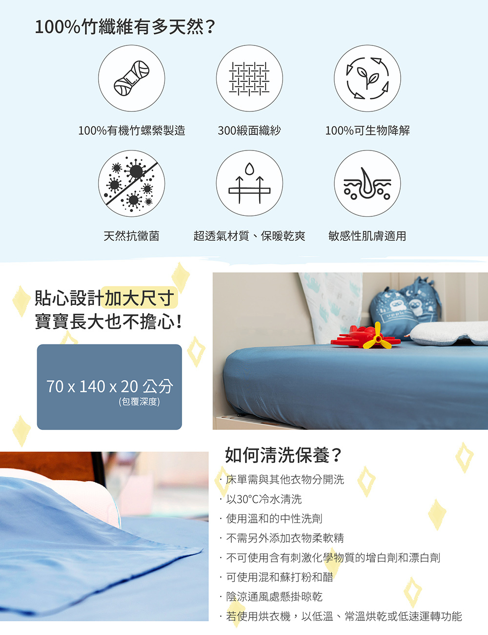 採用柔和寧靜的顏色,幫助您的寶貝更快速放鬆地入睡! 寶寶床包為柔軟的300TC(300織紗)高透氣調節溫度特性讓您的寶貝可以擁有乾爽舒適的睡眠(或玩耍)環境。我們為您的寶貝貼心設計這款床包,它的尺寸比一般的設計再大了一些些,讓您可以再用久一些些。一定要有的鬆緊帶設計讓床包在不同尺吋的嬰兒床都可以穩定不亂跑。絲緞般柔軟又防霉抗菌,親膚特性呵護寶寶細嫩的肌膚。