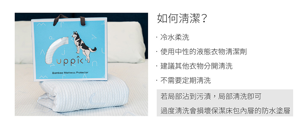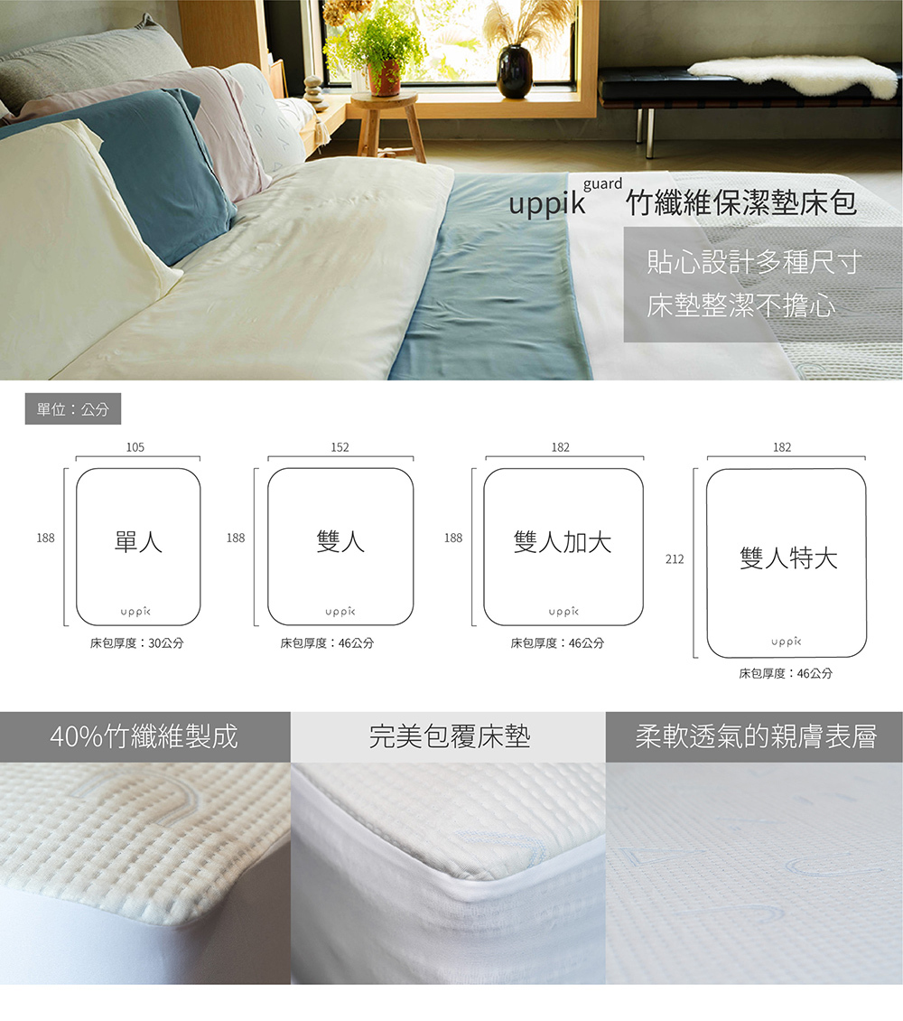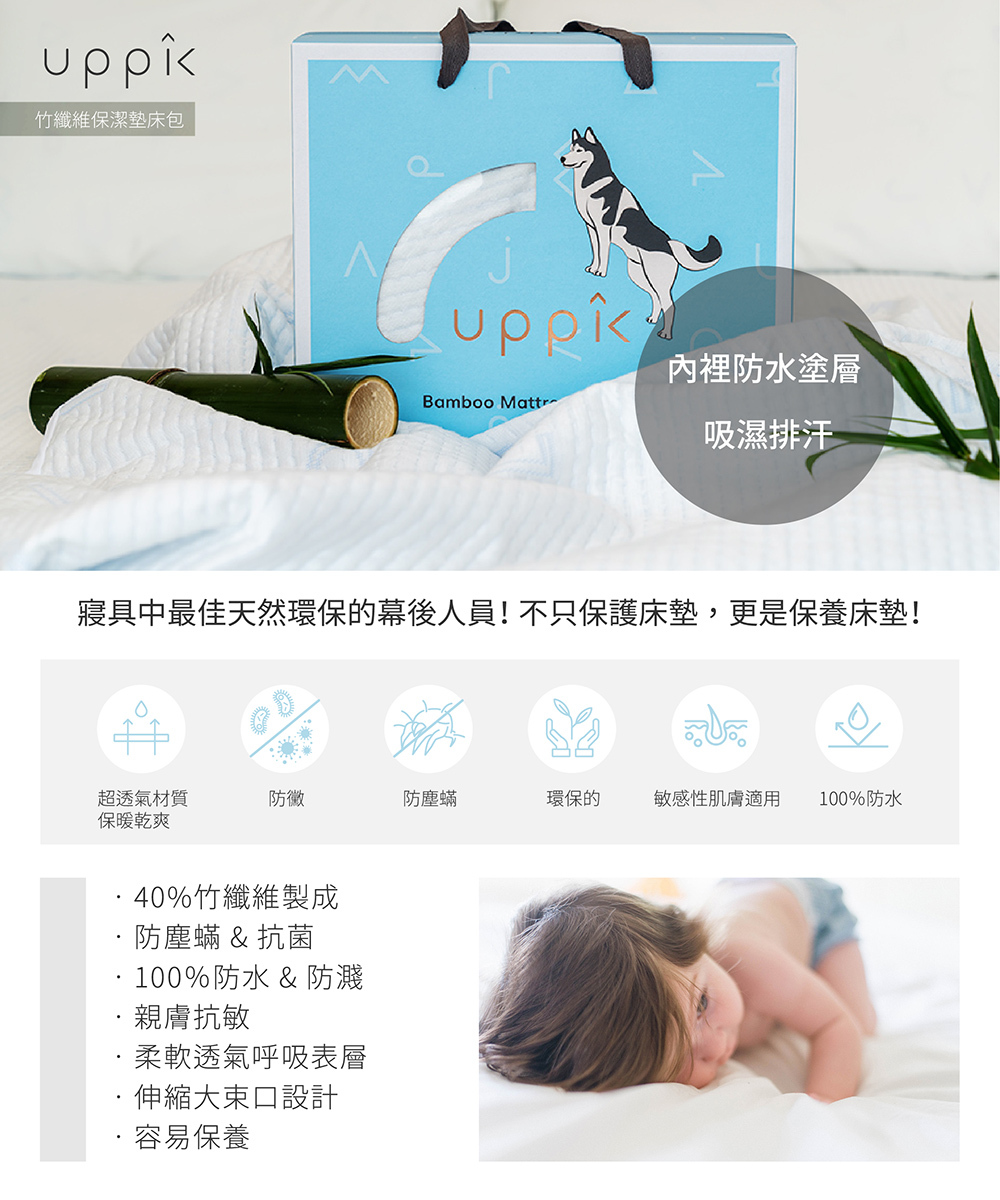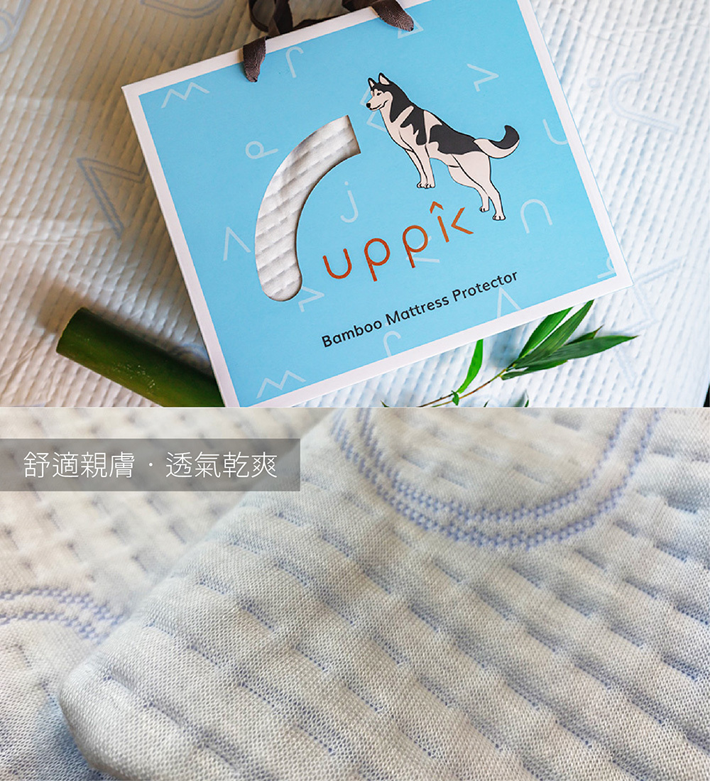 您愛您的床墊,我們都知道。 因此,我們特別研發了Uppikguard竹纖維保潔床包系列-來捍衛您床墊的清潔! 由40%竹纖維製成的三層吸濕排汗床墊保潔床包,能夠有效保持床墊的清潔乾爽,內裡防水塗層設計確保您的床墊在任何緊急狀態下都能保持清潔。專為成人設計,貼心的伸縮大束口設計細節,讓您可以隨著床墊大小調整保潔墊大小。