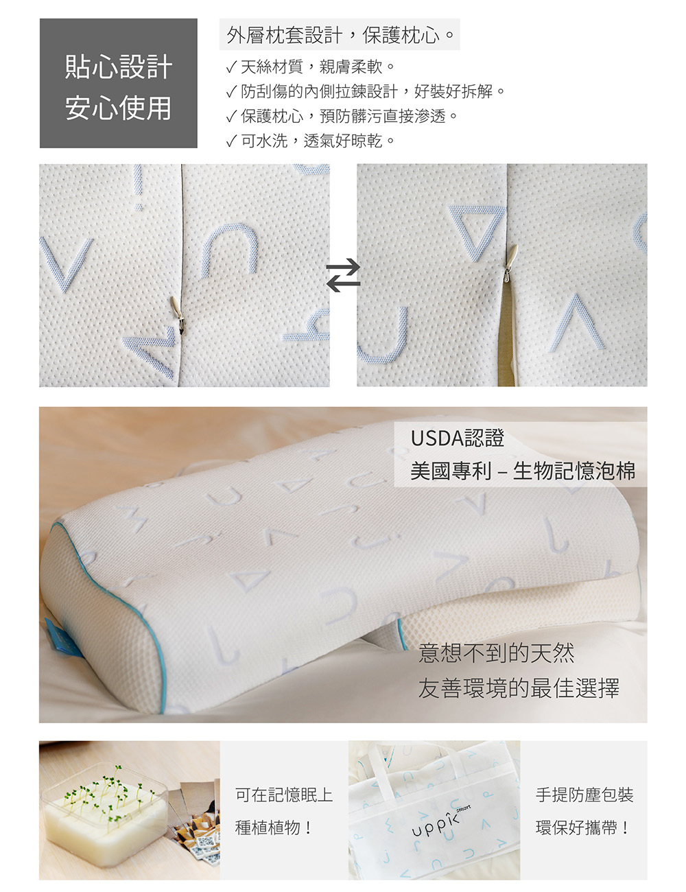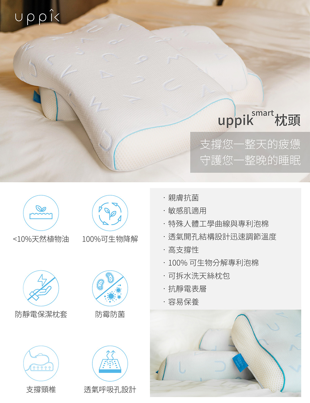 Uppik smart 系列枕頭產品為了喜愛高支撐度的您打造。 一樣使用可生物分解、防霉抗菌的專利記憶泡棉製成,非常適合頸部需要更多支撐的您。Uppik smart 系列枕頭支撐性高,開放透氣細胞結構及可拆洗的天絲防靜電枕包,給經過漫長的一天的您最理想的休息狀態。